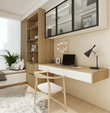 eyes, and exudes a calming vibe. The light wood desk,