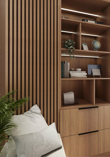 bookshelf, and chair add warmth to the space. While